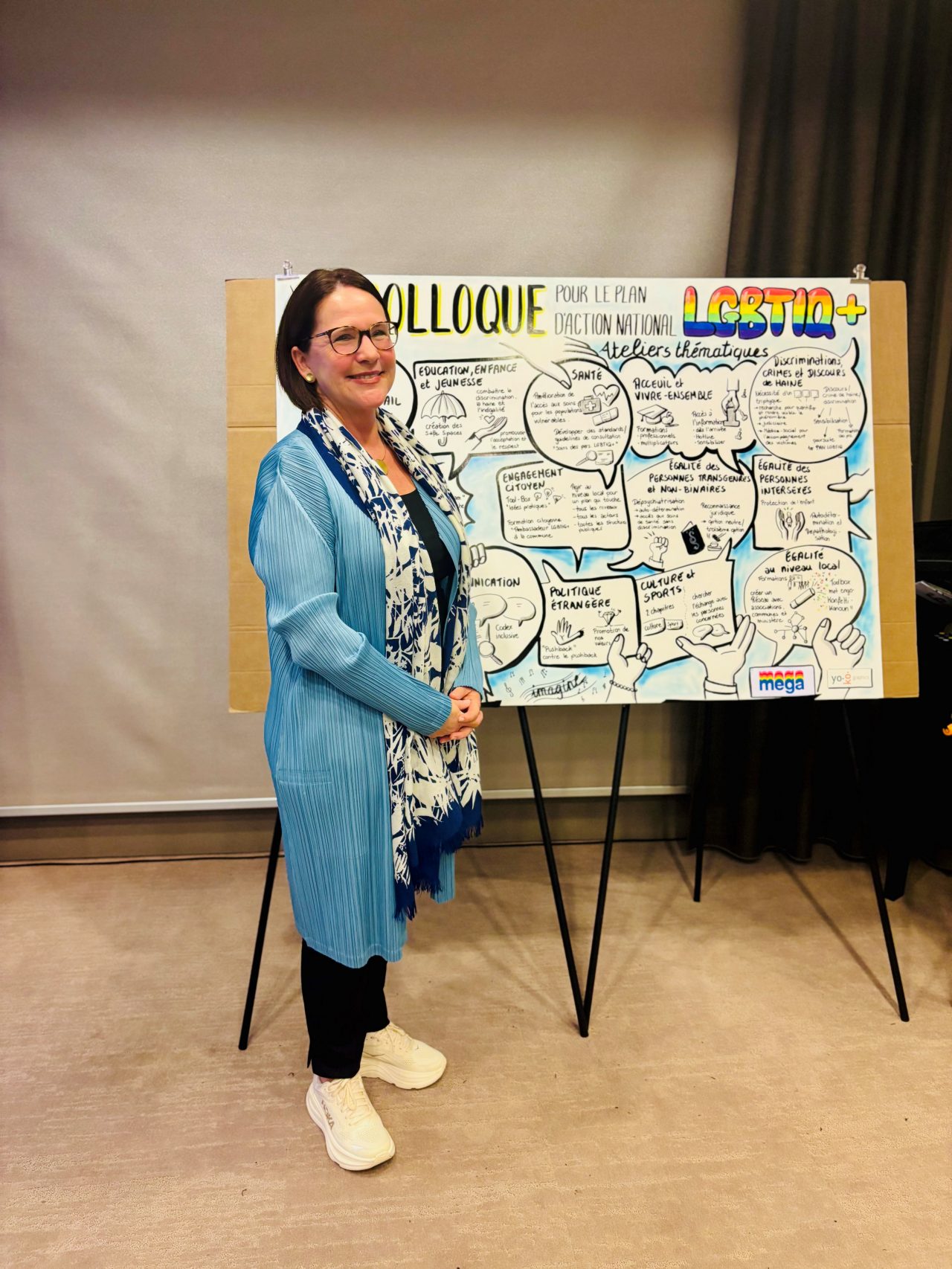 Romaine Boever du MEGA a présenté une rétrospective sur le premier Plan d'action national pour la promotion des droits des personnes lesbiennes, gays, bisexuelles, transgenres et intersexes (PAN LGBTI), adopté par le Gouvernement luxembourgeois en juillet 2018. L'accord de coalition 2023-2028 prévoit une adaptation du PAN.